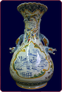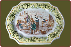 This big dish, untitled "The faiencier's jobs" is the last creation of the Manufacture. It illustrates the HB-Henriot Faiencerie know-how, from the moulds' creation to the free hand decoration and the firing.